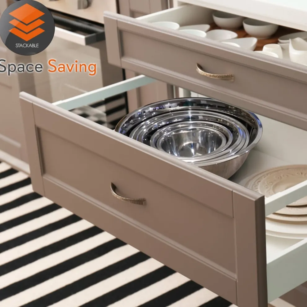 - SPACE SAVING STACKABLE: Nutri Chef nesting bowls metal mixing bowls set is a must-have house cookware item. It features a stackable design and can perfectly nest together inside each other for easy storage and helps declutter home kitchen cupboards