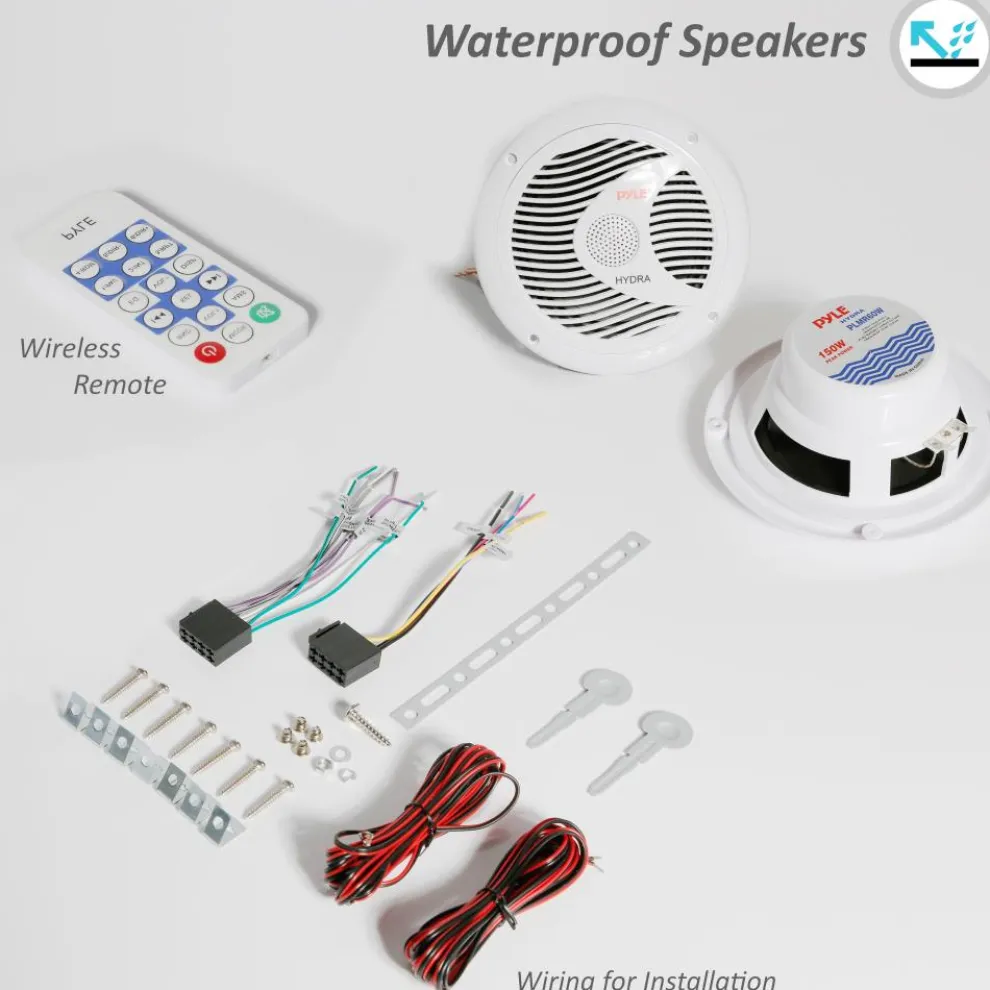 - Includes Stereo Receiver, (2) Waterproof Speakers + Accessory Kit