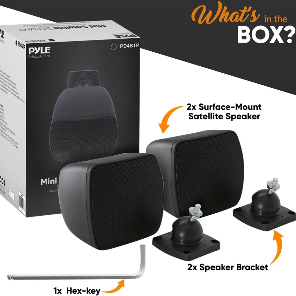 - BUILT TO LAST: Made with engineered ABS material, Pyle satellite speakers will surely prove their longevity for long-term use. It includes a ball-joint full-motion plastic bracket for surface mounting and angle adjustment for optimal sound dispersion