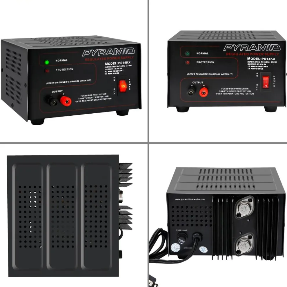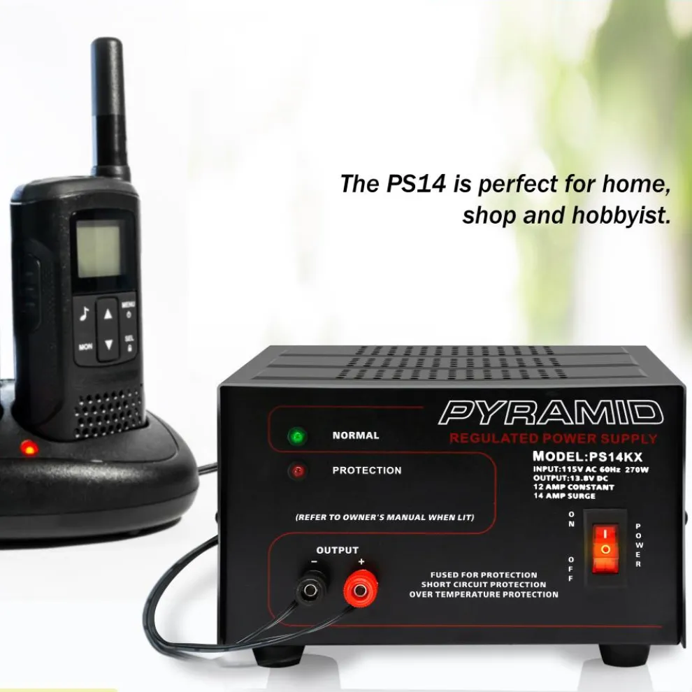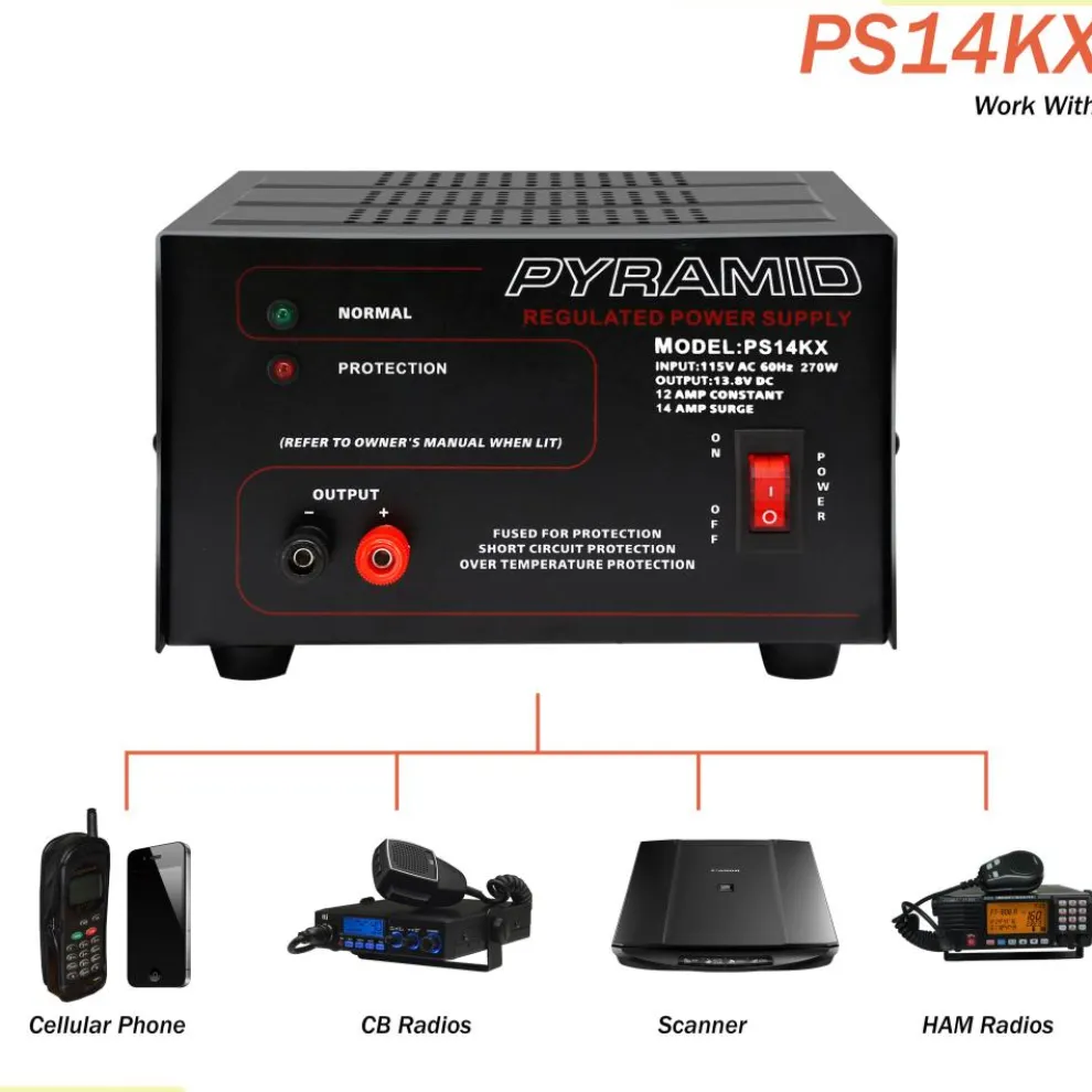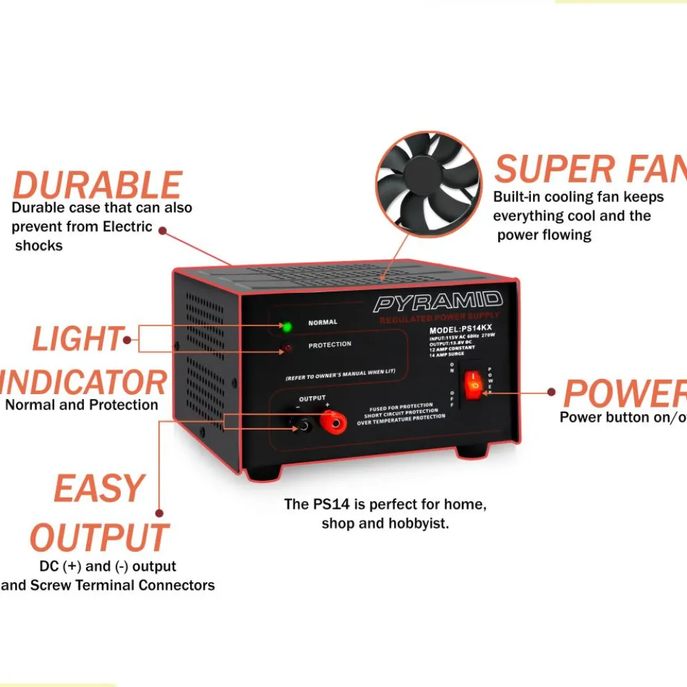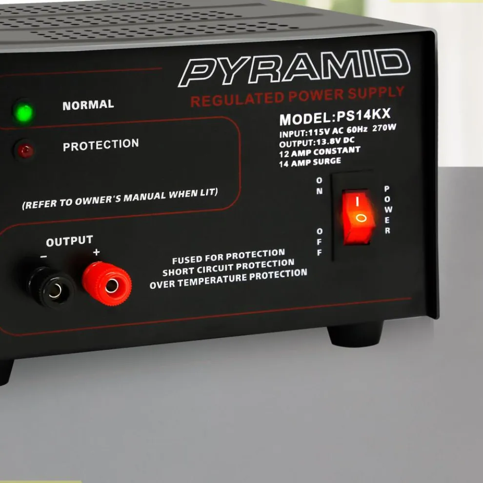 - Power ON / OFF Switch – Pyramid Compact Hobby Power Supplies Safe for Tabletop Placement Amperage: 12.0 AMP (Constant), 14.0 AMP (Surge) – Connectors/Hardwire Terminals: Red Positive (+), Black Negative (-)