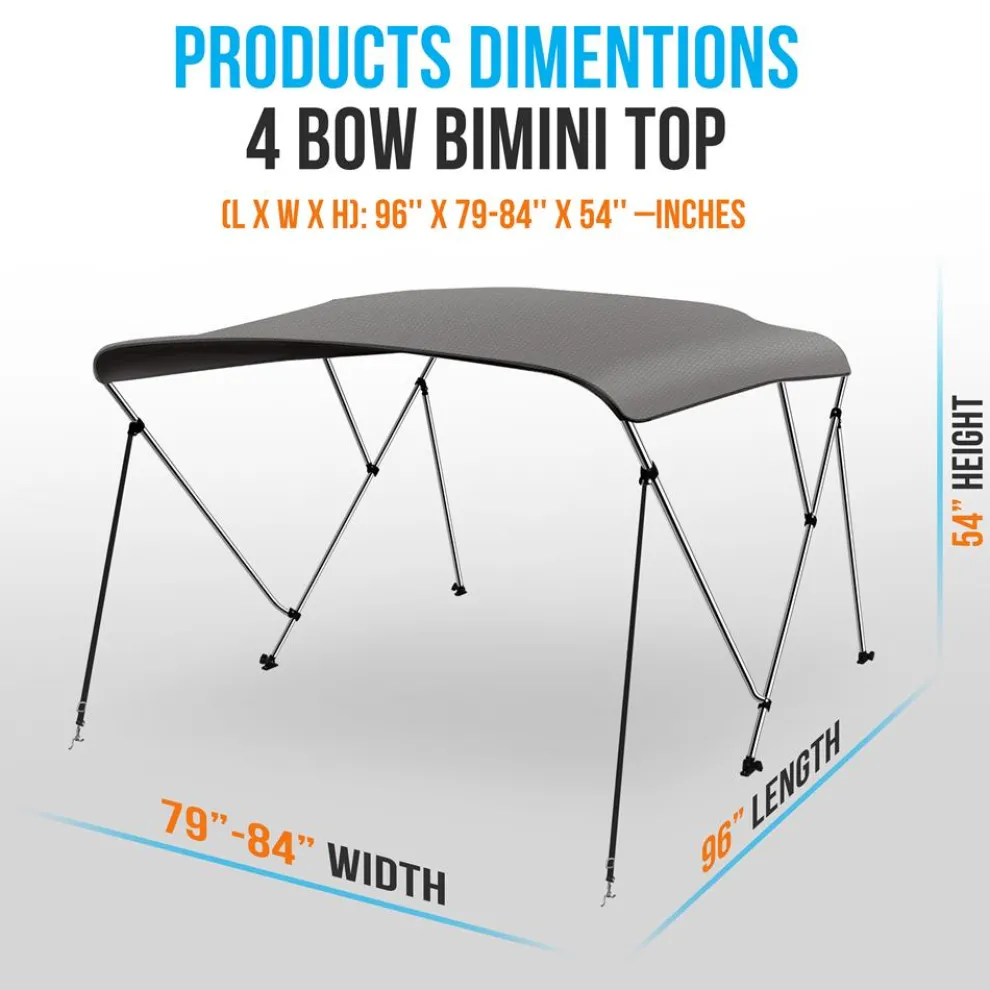 - 1 Diameter Aluminum Frame – Double-walled Main Bow Legs for Maximum Strength – 2 Straps and 2 Rear Support Poles – Very Easy to Install – Waterproof and UV Resistant in Marine Environment