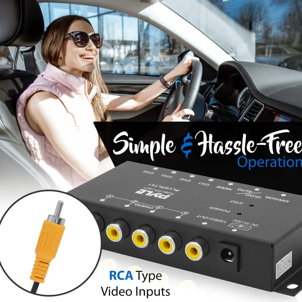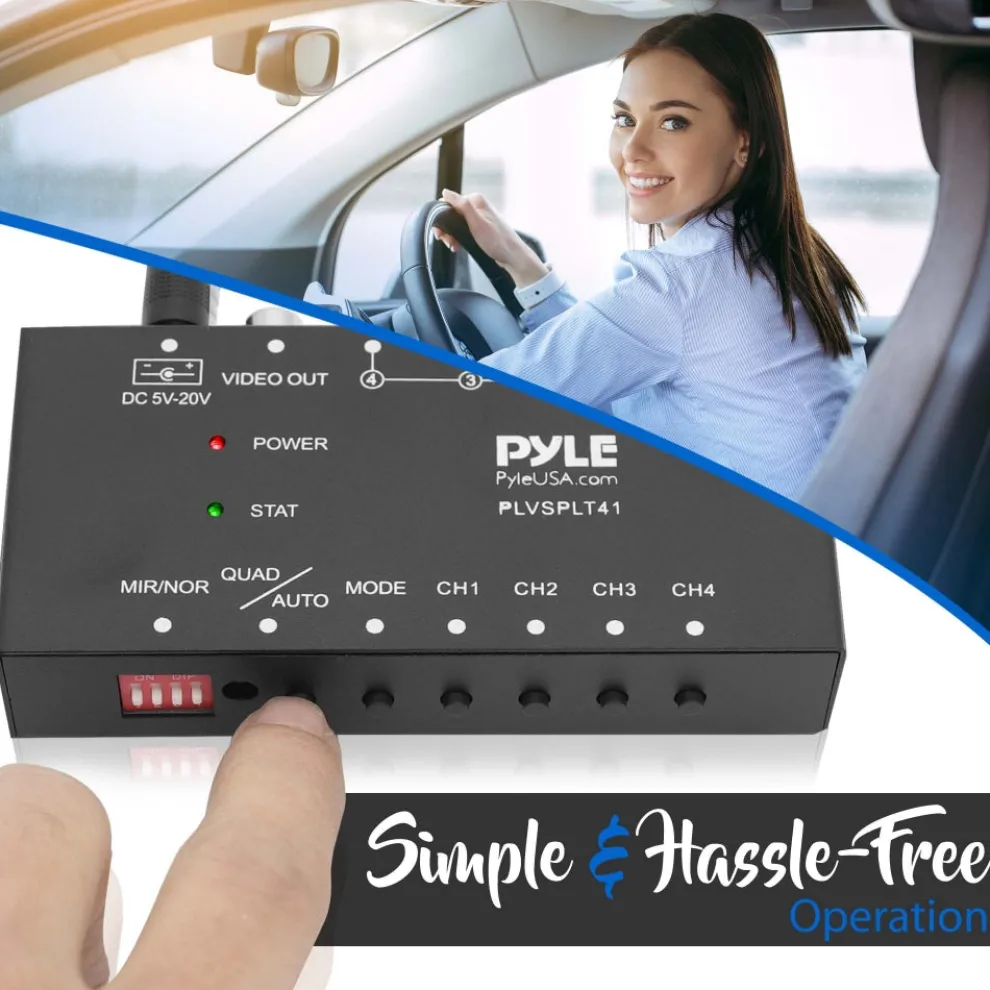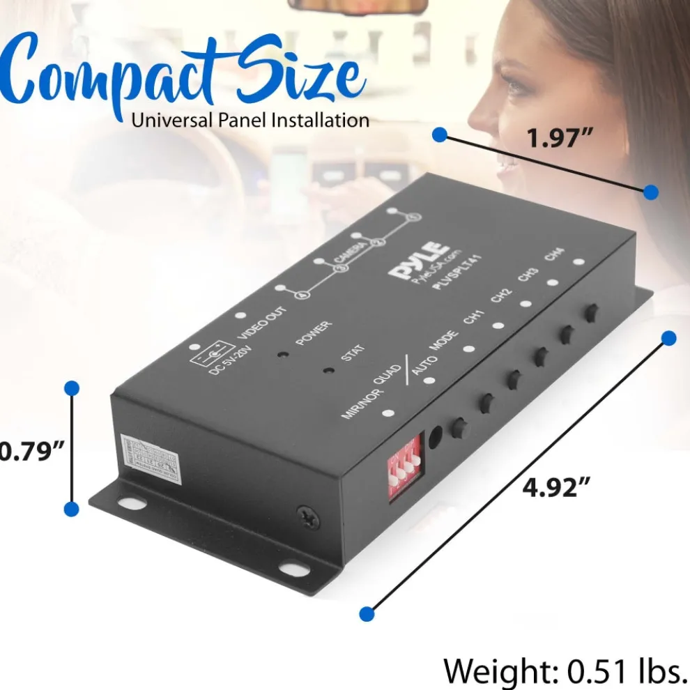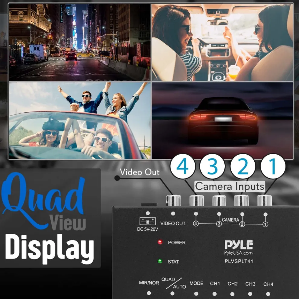 - 4-Ch. Video Splitter Controller – Digital Picture Video Signal Switcher – Quad View Display, See All 4 Cameras On-Screen – Selectable Viewing Modes: 1 / 2 / 3 / 4 Cameras – Mirror Image Function for Backup Camera System Support