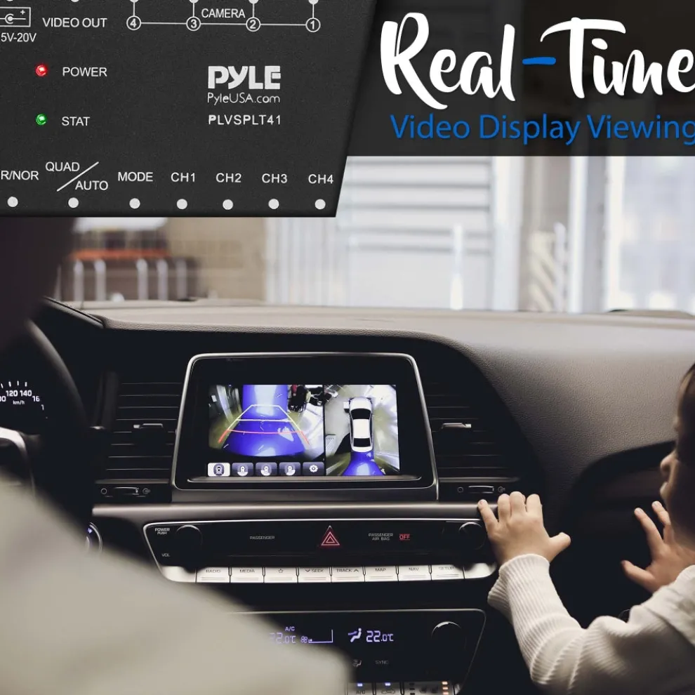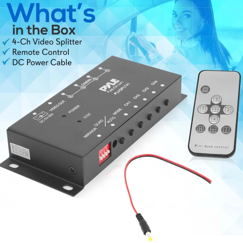 - For Backup Cameras, Cam Systems, Security Surveillance, CCTV, Panel Monitor Display Screens What’s In The Box: – 4-Ch Video Splitter – Remote Control – DC Power Cable Technical Specs: