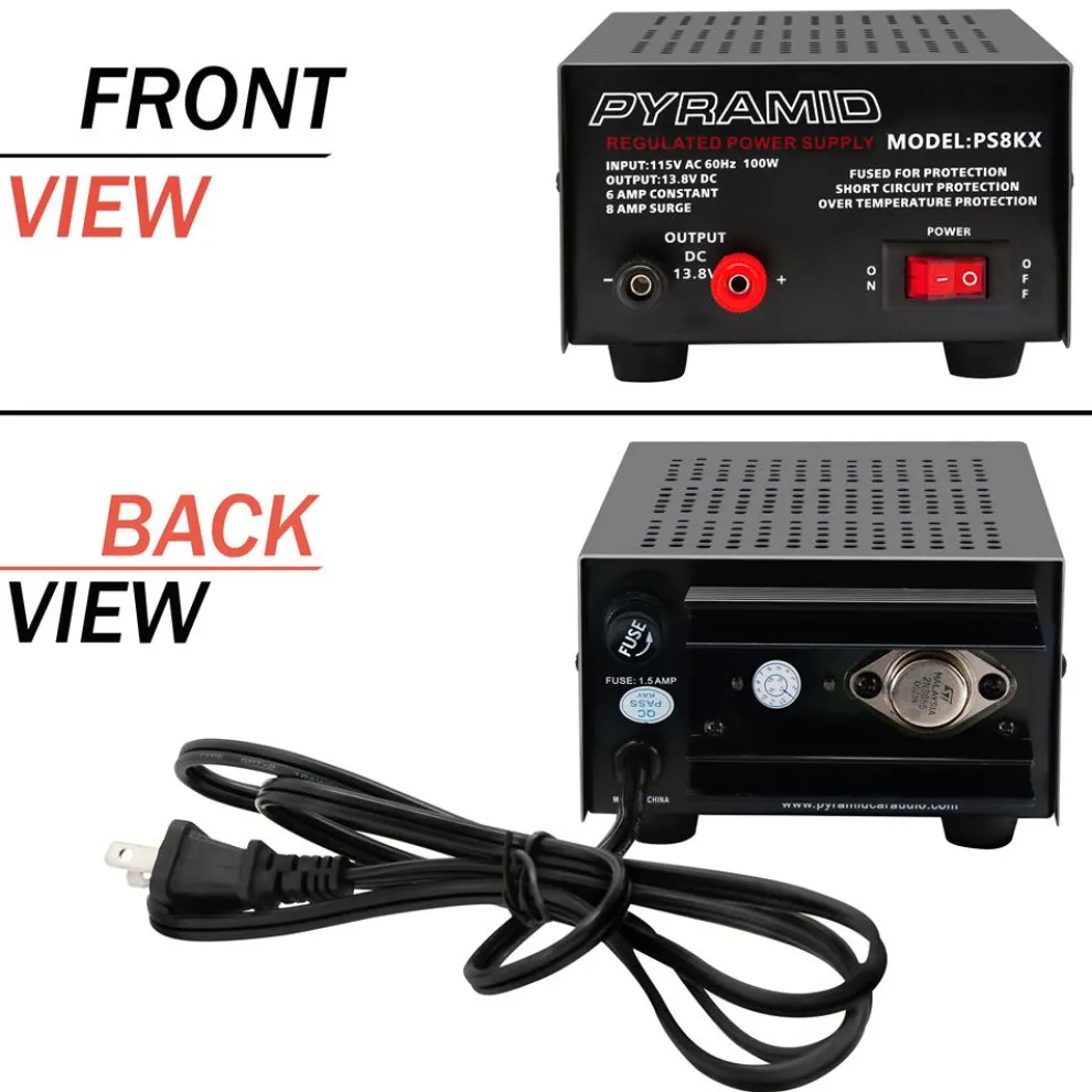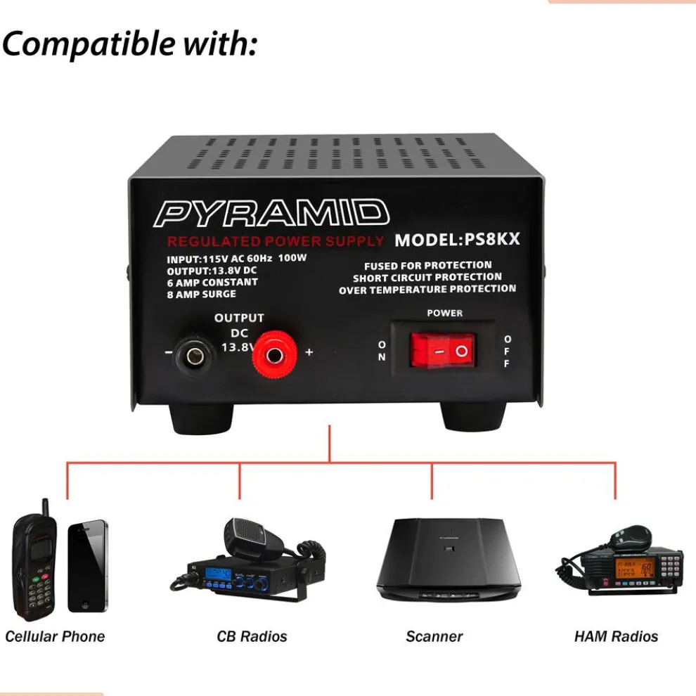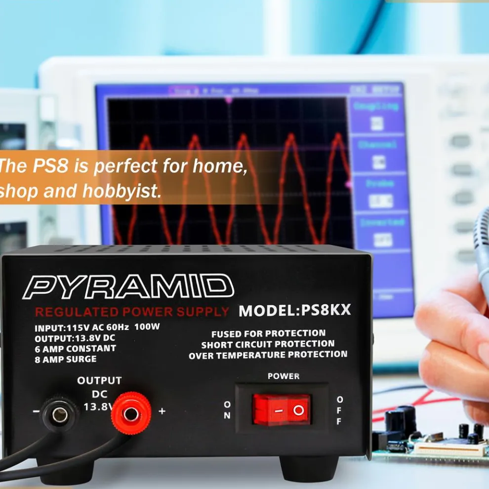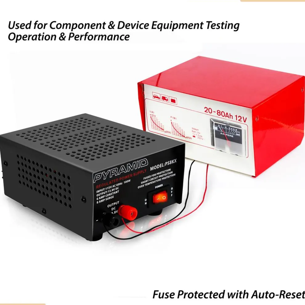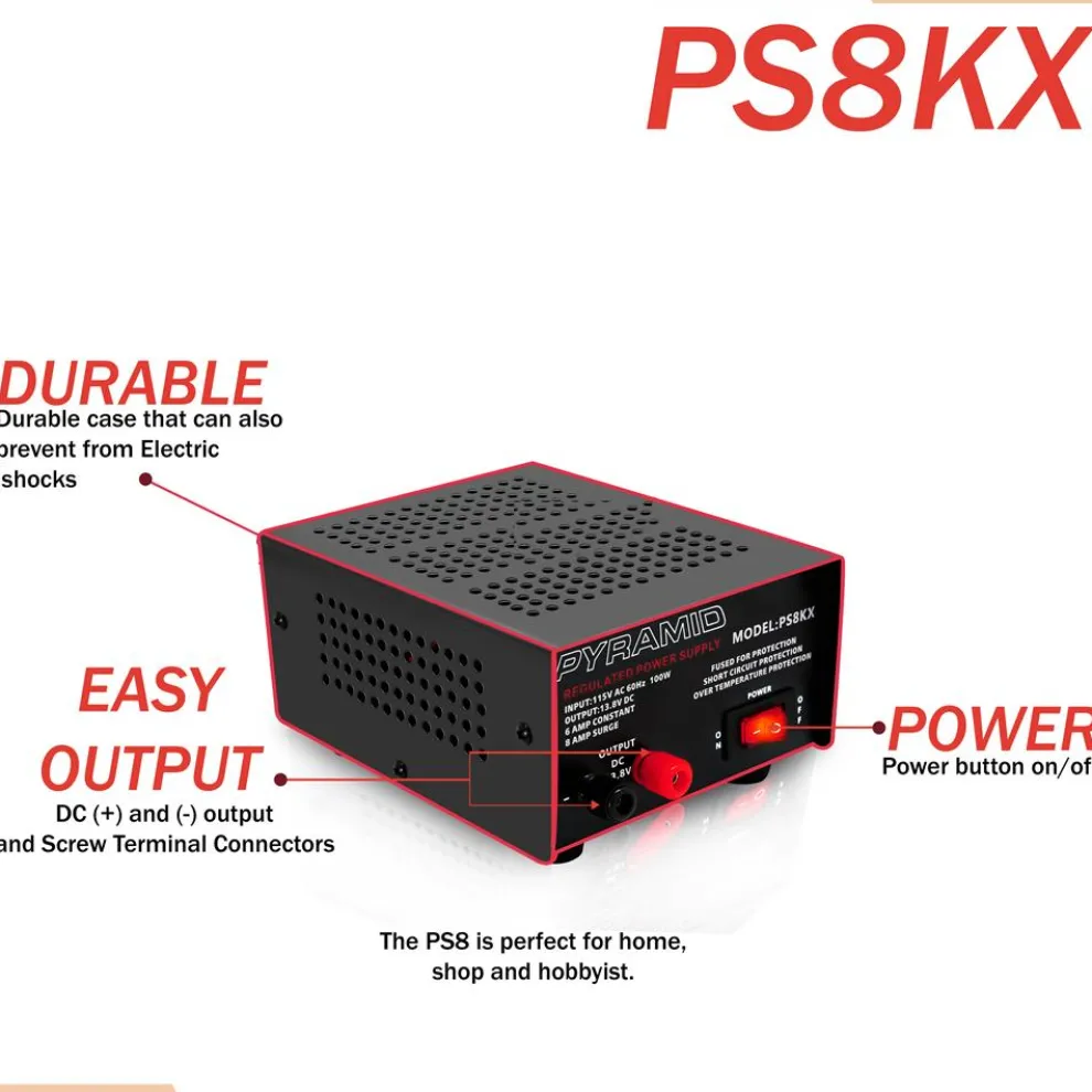 - Power ON / OFF Switch – Pyramid Compact Hobby Power Supplies Safe for Tabletop Placement Amperage: 6.0 AMP (Constant), 8.0 AMP (Surge) – Connectors/Hardwire Terminals: Red Positive (+), Black Negative (-)