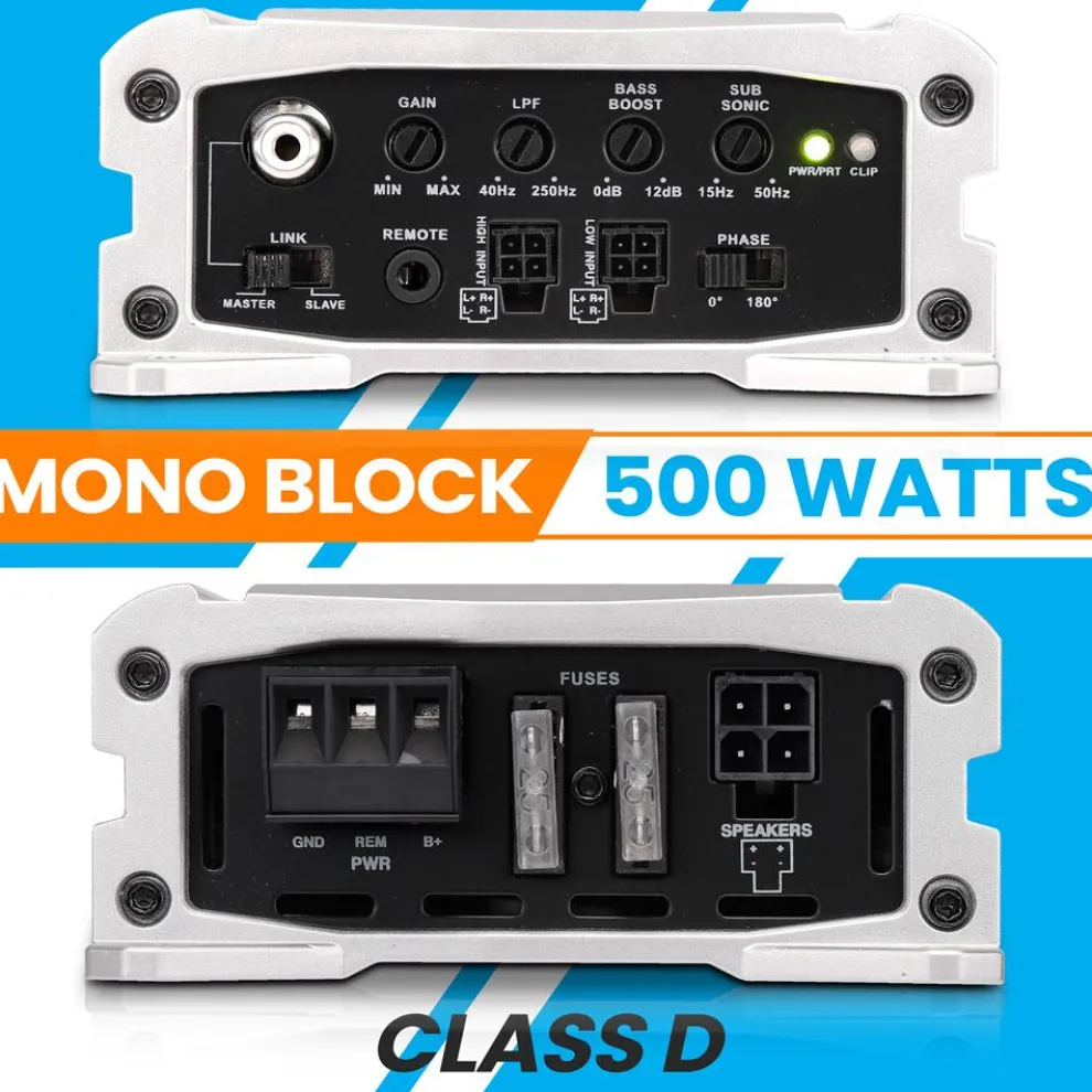 - 500W x 1 @ 1 ohm @ 1% THD @ 14.4V