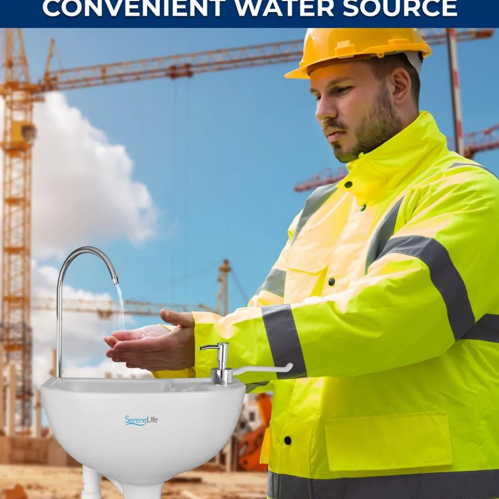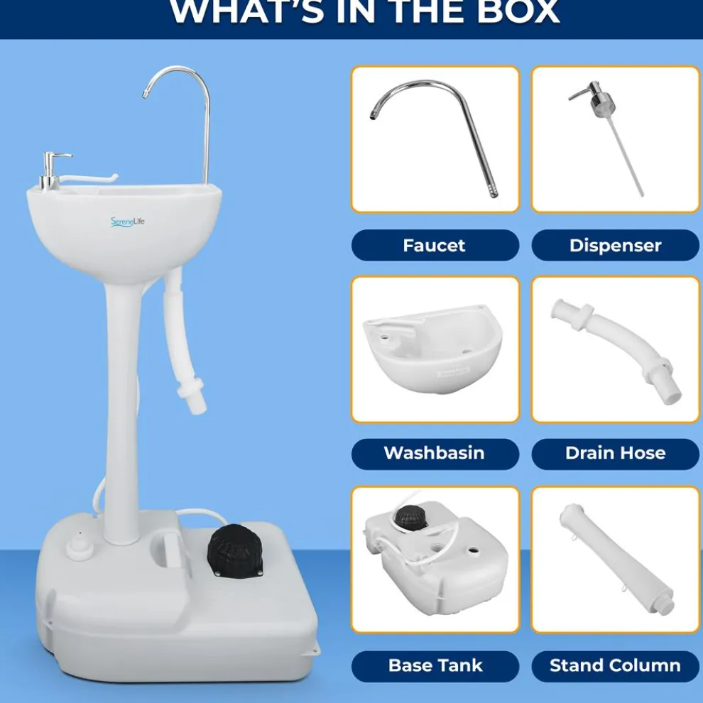 The SereneLife Portable Hand-Wash Sink / Faucet Station (5+ Gal. Capacity) – Compact & Portable Hand-Wash Sink Station – Quick Assemble Design for On-Site Setup – Simple & Hassle-Free Operation – Hands-Free Water Dispenser Activated via Foot Pump – Integrated Liquid Soap Dispenser – Rugged & Reliable Construction – Built-in Carry Handle & Rolling Wheels – Can Be Transported Even When Filled with Water – Stainless Steel Towel Holder – Includes Flexible Drainage Hose – Ability to be Fastened to Ground Floors for Extra Stability – Perfect for Outdoor Social Events, Worksites, Camping, Boating, etc. – Technical Specs: – Bottom Water Tank Capacity: 19 liters / 5+ gallons – Foot Pump Dispenser Rate: 180ml / per step – Liquid Soap Dispenser Capacity: 3 liters.
