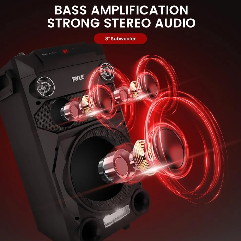 - PORTABLE / POWERFUL: This Karaoke Amplifier Speaker System by Pyle is equipped with 8 inch Subwoofer for Full Range Stereo Sound Reproduction and cool Flashing DJ Lights which makes it ideal for patio party / music jam. It also has a retractable handle and wheels for easy transport.
